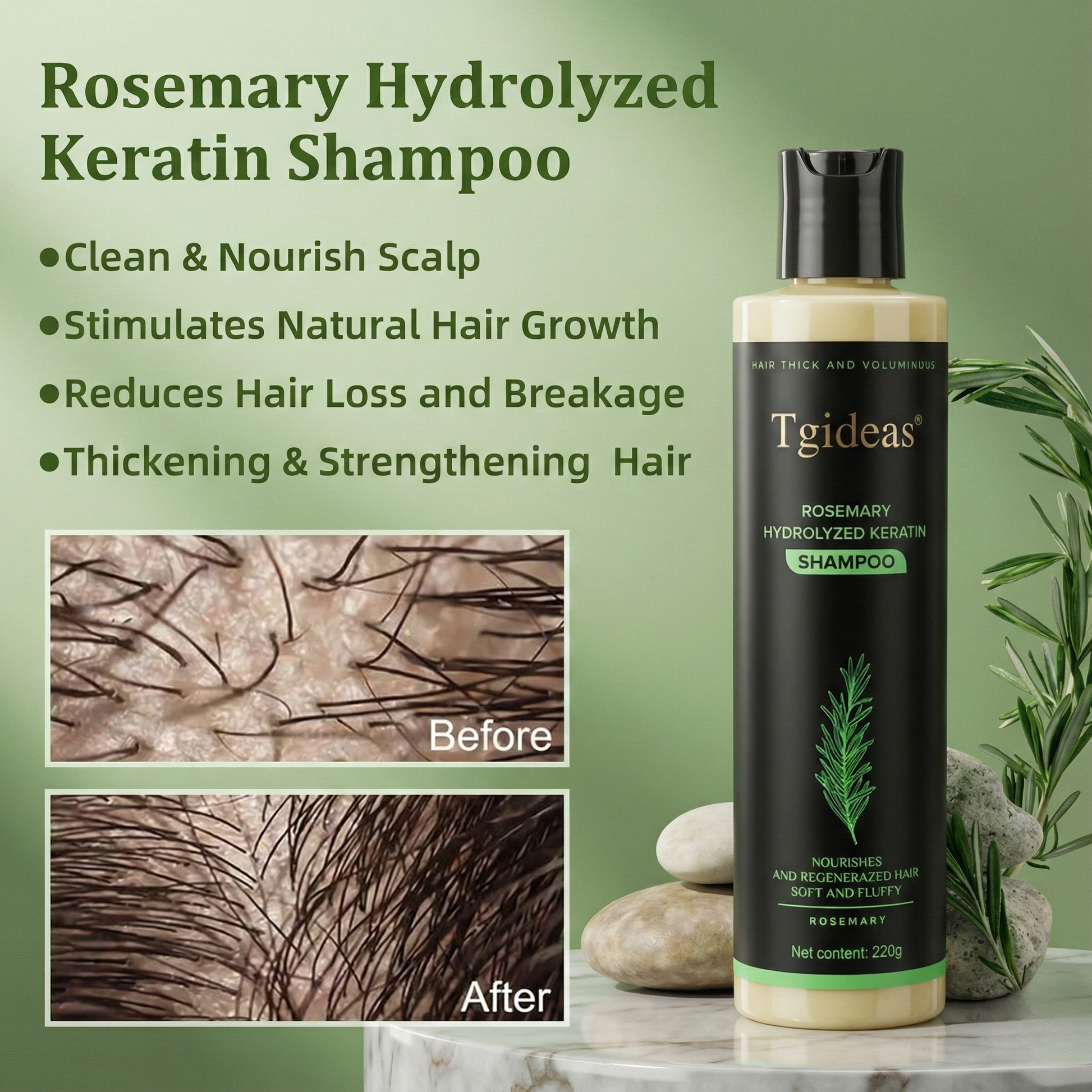 At the same time, rosemary improves scalp health and encourages new growth, so hair grows in stronger, healthier, and over time, faster.